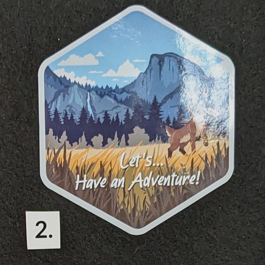 A series of vinyl stickers drawing inspiration from the simplified style utilized in many National Park stickers of similar size and subject matter. Our twist adds a notable cryptid amidst the parks landscapes and the signature phrase from our show - “Let’s… Have an Adventure~!”