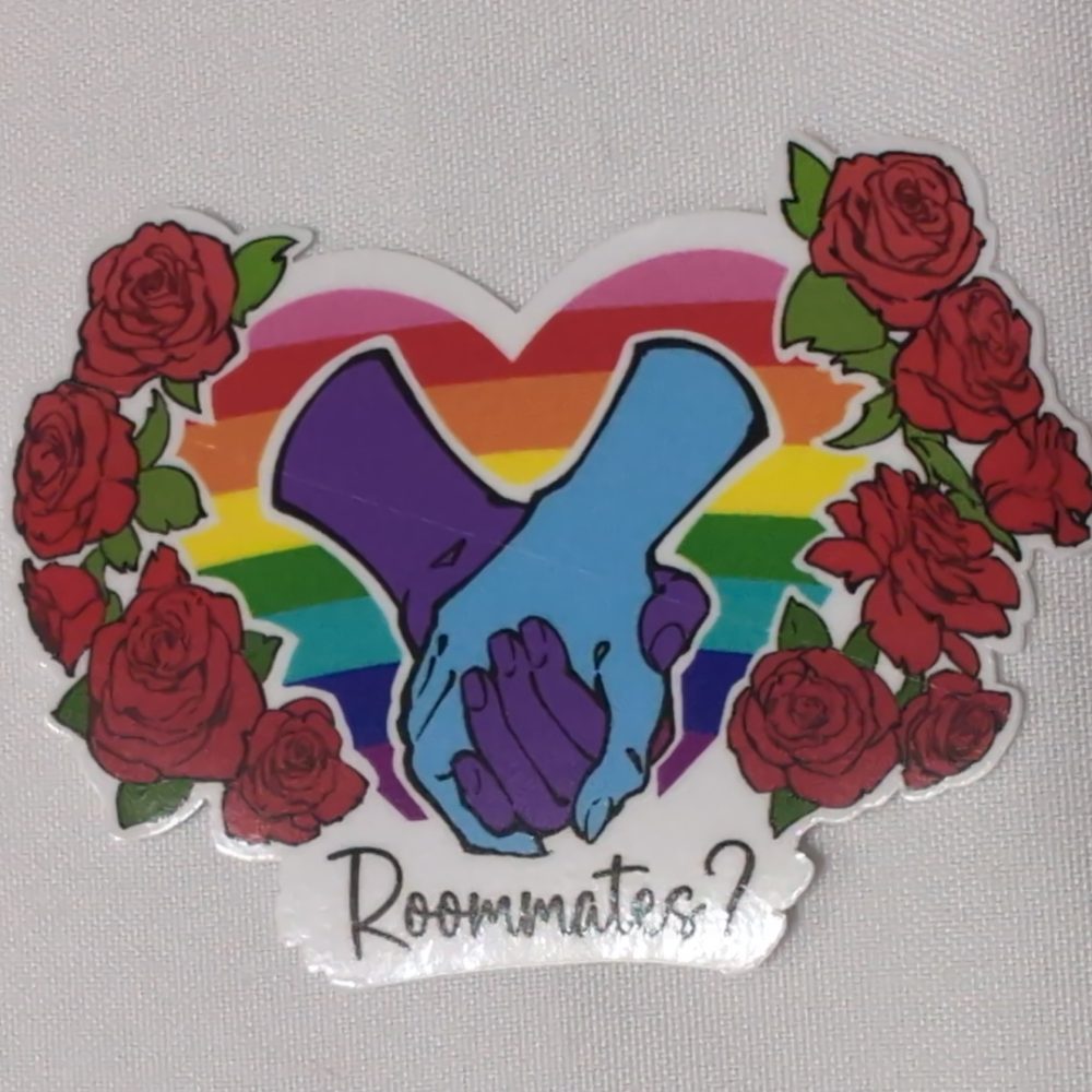 A sticker depicting two clasped hands in front of a heart that is filled with classic rainbow pride flag colors and framed by red roses, with the text “Roommates?” beneath. An inside joke from the podcast, referencing the common trope amongst sapphic relationships in fiction to assume 2 characters are platonic rather than romantic. The original "Roommates" sticker is the lesbian flag with violets, but we decided to expand the series to include several more sexualities.